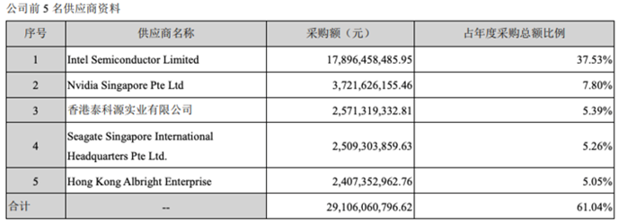 2019 年全年,浪潮的第一大供應(yīng)商為 Intel,采購額為將近 179 億元人民幣,占比高達 37.53%;第二位是英偉達,采購額超過 37 億元人民幣,占比 7.8%。由此,也可以間接感知到 Intel 此番斷供對浪潮業(yè)務(wù)的影響。