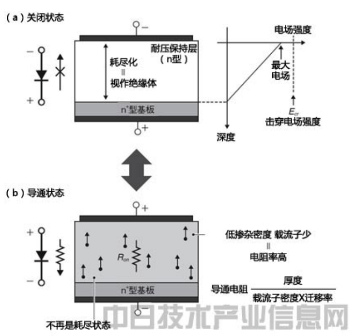 這需要從功率元件的基本工作原理說起。功率元件通常在截至和導(dǎo)通兩種狀態(tài)下使用。關(guān)閉狀態(tài),就是必須在所要求電壓下完全斷開電流。打開狀態(tài),要求在損失最小的情況下,通過電流。關(guān)閉狀態(tài)下,使元件無法保證絕緣狀態(tài)的電壓叫做耐壓,一般而言,耐壓越高、導(dǎo)通電阻越小,元器件的性能也就越高。但由于功率器件的工作原理,耐壓和導(dǎo)通電阻之間存在此消彼長(zhǎng)的關(guān)系。