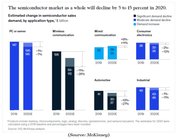 每過一周,國際貨幣基金組織(IMF)就會采取所謂的“大封鎖”,半導體行業一直在下調經濟預測。麥肯錫預計,到2020年,全球芯片市場的銷售需求將下降5%至15%,預計一些IC細分市場將出現大幅下滑,超過其在其他市場的預期。這是迄今為止最糟糕的預測。
