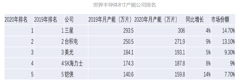 但8寸晶圓的產能卻遠跟不上需求增長的速度,甚至8寸晶圓廠在逐年關閉。在中國大陸來說,芯片項目在技術先進性上的導向以及盈利,很多項目在落地時就瞄準了12寸產線,還有一些8寸產線轉成12寸產線。根據第三方數據機構IC Insights統計,三星電子2020年底月產能為306.0萬片8寸晶圓,位居第一大廠,其次為臺積電。