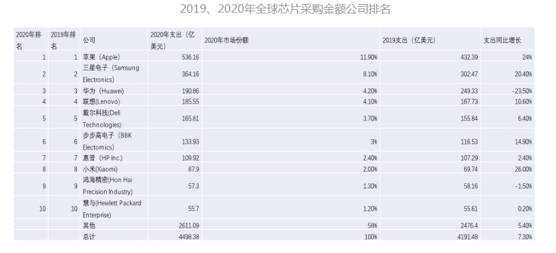 2019、2020年全球芯片采購金額公司排名