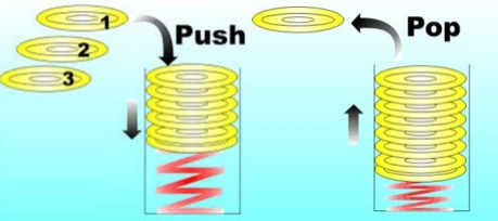 作為堆棧如何工作的一個(gè)例子,可以把它看成一個(gè)彈簧加載托盤分發(fā)器,這種類型經(jīng)常在自助餐廳中發(fā)現(xiàn)。每個(gè)托盤上都刻有數(shù)字。托盤依次從頂部裝入,每個(gè)托盤都放置在已經(jīng)裝入的托盤上,彈簧進(jìn)行壓縮,以便在必要時(shí)為更多托盤留出空間。例如,在圖中,托盤編號(hào)為42、23、2、9,先裝載42個(gè)托盤,后裝載9個(gè)托盤。